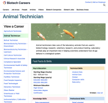 This page from Bio-Link's career website features information about the different jobs and opportunities in the animal technician career area. This page includes a brief description of animal technicians, who "take care of the laboratory animals that are used in biotechnology research, veterinary...