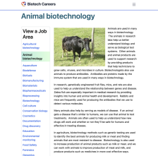 This page from Bio-Link's career website features information about the different jobs in the animal biotechnology career area. This page includes a brief description of the animal biotechnology field, related career areas, jobs in the career area, a link to a related photo journals of a laboratory...