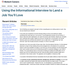 This article from Bio-Link's Career website discusses how to have a successful informational job interview. The article includes three topics that should be addressed in an interview. Topics include "a summary of your professional interests, background and intent in meeting; identification of the...