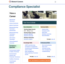 This page from Bio-Link's career website features information about the different jobs and opportunities in the compliance specialist career area. This page includes a brief description of compliance specialists, who "manage their organization's need to obey regulations such as grant requirements,...