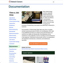 This page from Bio-Link's career website features information about the different jobs and opportunities in the documentation specialist career area. This page includes a brief description of the documentation specialists field, which ensures that "proper records are kept throughout the processes of...