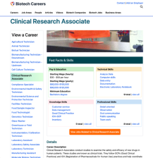 This page from Bio-Link's career website features information about the different jobs and opportunities in the clinical research associate career area. This page includes a brief description of clinical research associates, who "are responsible for conducting studies to examine the safety and...