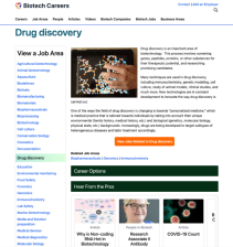 This page from Bio-Link's career website features information about the different jobs and opportunities in the drug discovery career area. This page includes a brief description of the drug discovery field, which "involves screening genes, peptides, proteins, or other substances for their...
