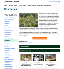 This page from Bio-Link's career website features information about the different jobs and opportunities in the cosmetics career area. This page includes a brief description of the cosmetics field, which uses biotechnology "both to discover and manufacture components of cosmetics and to evaluate the...