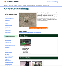 This page from Bio-Link's career website features information about the different jobs and opportunities in the conservation biology career area. This page includes a brief description of the conservation biology field, which is "concerned with monitoring the health and population of wild animals...
