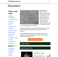 This page from Bio-Link's career website features information about the different jobs and opportunities in the education career area. This page includes a brief description of the education field, which explains that "many colleges hire biotechnicians to help prepare materials and assist students...