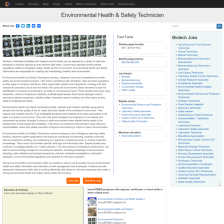 This page from Bio-Link's career website features information about the different jobs and opportunities in the environmental health and safety technician career area. This page includes a brief description of environmental health and safety technicians, who "develop, implement, and direct...
