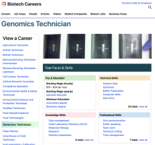 This page from Bio-Link's career website features information about the different jobs and opportunities in the genomics technician career area. This page includes a brief description of genomics technicians, who "use a range of technologies related to determining and comparing DNA and RNA...
