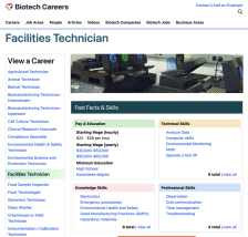 This page from Bio-Link's career website features information about the different jobs and opportunities in the facilities technician career area. This page includes a brief description of facilities technicians, who "are responsible for the operation and maintenance of biomanufacturing buildings...