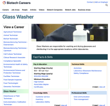 This page from Bio-Link's career website features information about the different jobs and opportunities in the glass washer career area. This page includes a brief description of glass washer, who handles and cleans glassware properly to insure usefulness in the laboratory. Common tasks, education...