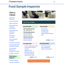 This page from Bio-Link's career website features information about the different jobs and opportunities in the food sample inspector career area. This page includes a brief description of food sample inspectors, who "provide inspections of organizations that handle and prepare food, including...
