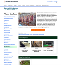 This page from Bio-Link's career website features information about the different jobs and opportunities in the food safety career area. This page includes a brief description of the food safety field, and links to related career areas and articles. Jobs in food safety include food sample inspector,...