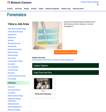 This page from Bio-Link's career website features information about the different jobs and opportunities in the forensics career area. This page includes a brief description of the forensics field, and links to related career areas, jobs in the field, and videos. A featured job in the forensics...