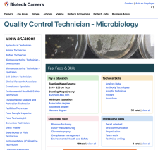 This page from Bio-Link's career website features information about the different jobs and opportunities in the microbiology quality control (QC) technician career area. This page includes a brief description of microbiology quality control (QC) technicians, who "are responsible for assuring quality...