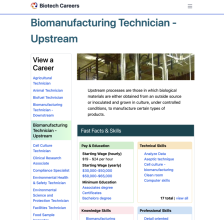 This page from Bio-Link's career website features information about the different jobs and opportunities in the biomanufacturing technician - upstream career area. This page includes a brief description of upstream processes, which in biomanufacturing is where "biological materials are either...