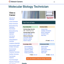 This page from Bio-Link's career website features information about the different jobs and opportunities in the molecular biology technician career area. This page includes a brief description of molecular biology technicians. Common tasks, education and training requirements, related biotechnology...