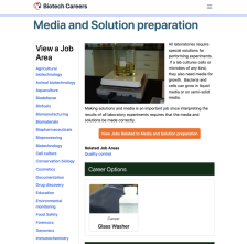 This page from Bio-Link's career website features information about the media and solution preparation career area. This page includes a brief description of media and solution preparation and its importance to laboratory experiments. Links to related career areas are also included, as well as links...