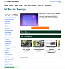 This page from Bio-Link's career website features information about the different jobs and opportunities in the molecular biology career area. This page includes a brief description of the molecular biology field, which "involves working with DNA, RNA, cells, and/or proteins." Links to related...