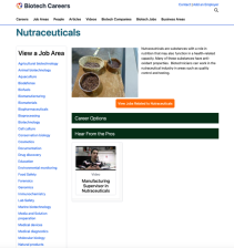 This page from Bio-Link's career website features information about the different opportunities in the nutraceuticals career area. This page includes a brief definition of nutraceuticals, which "are substances with a role in nutrition that may also function in a health-related capacity." In the...