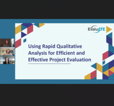 This webinar, published by EvaluATE: Evaluation Resource Center for Advanced Technological Education, discusses the use of rapid qualitative analysis (RQA) in Advanced Technological Education (ATE) evaluation. Throughout the video, presenters introduce RQA and provide tips for efficiently...