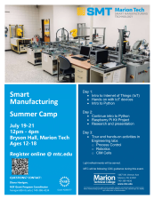 This collection, published by Marion Technical College, provides promotional materials for the 2021 and 2022 Smart Manufacturing Summer Camps. This 3-day program, located at Marion Technical College's campus, engaged students from ages 12 to 18 in introductory Smart Manufacturing topics. The program...