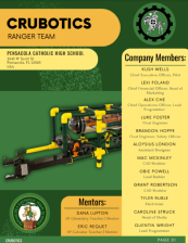 This 21-page report, published by Pensacola Catholic High School, describes the design and construction of the underwater remotely operated vehicle (ROV) created by the Crubotics Ranger Team for the Ranger Class of the 2023 MATE ROV competition. MATE ROV is a global competition that challenges STEM...