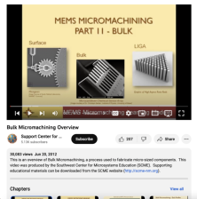 This video, created by Support Center for Microsystems Education (SCME), provides an overview bulk micromachining. The lecture runs for 6:17 and describes the process of bulk micromachining as a process used to fabricate micro-sized components. More information can be found on the SCME website.