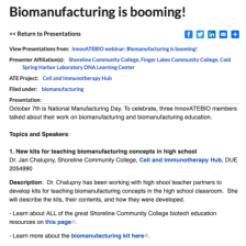 This video from InnovATEBIO provides three presentations about biomanufacturing. In the first presentation, Jan Chalupny talks about kits for teaching biomanufacturing concepts in high school. Chalupny describes the kits, their contents, and how they were developed. Challenges with implementing the...