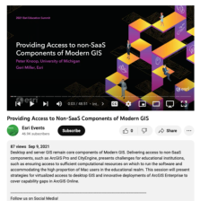 This video, from the 2021 Esri Education Summit, provides strategies for virtualized access to desktop GIS and innovative deployments of ArcGIS Enterprise to cover capability gaps in ArcGIS Online. The video focuses on non-Saas components, which include desktop apps and ArcGIS Enterprise. Options...