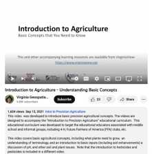 In this video, Dan Swafford from Virginia Tech introduces students to precision agriculture. Swafford explores basic agricultural concepts, such as crop yield, and also highlights the roles of and decision-making for plant food, fertilizers, minor elements (micronutrients), nitrogen, phosphorus,...