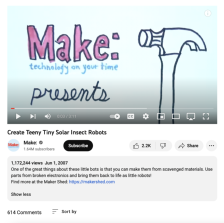 This video is provided by Make Magazine and covers solar insect robots. These tiny robots can be made from scavenged materials including broken electronics. This video runs 3:11 minutes in length.