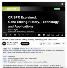 This video from Bio-Rad Explorer describes CRISPR. In the video, Damon Tighe highlights CRISPR's applications, history, ethics, and activities; describes how CRISPR-Cas9 works; and provides an example of modeling a Cas9 molecular mechanism. The video recording runs 24:02 minutes in length.