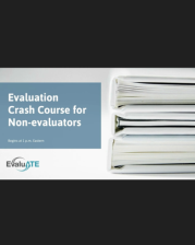 This webinar, published by Western Michigan University Evaluation Center, discusses evaluation for beginners. This presentation also serves as a refresher on the basics of evaluation. In the video, Lyssa W. Becho outlines a fictional scenario where an individual has an idea for an ATE proposal. To...