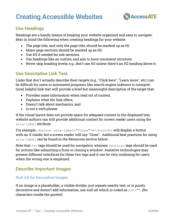 This tip sheet, created by the National Center for Accessible Media, provides guidelines for creating accessible websites. It covers the topics of headings, descriptive link text and button labels, image descriptions, colors, and more. The tip sheet also offers links to additional resources for Web...
